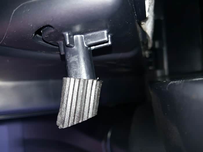 别太担心弄断了,一定要猛。我曾尝试把两边的绊扣都挤出来,可是事实证明,不可能。一边先顶着内壁,然后把另一边也顶着内壁,最后一起拉出来,是不可能的,车友不用再尝试了。只有先出左边,然后硬把右边的扣子强行带出来才是正解。