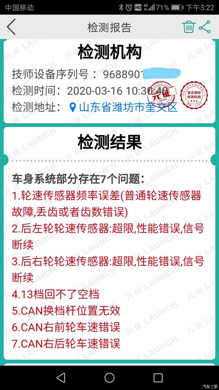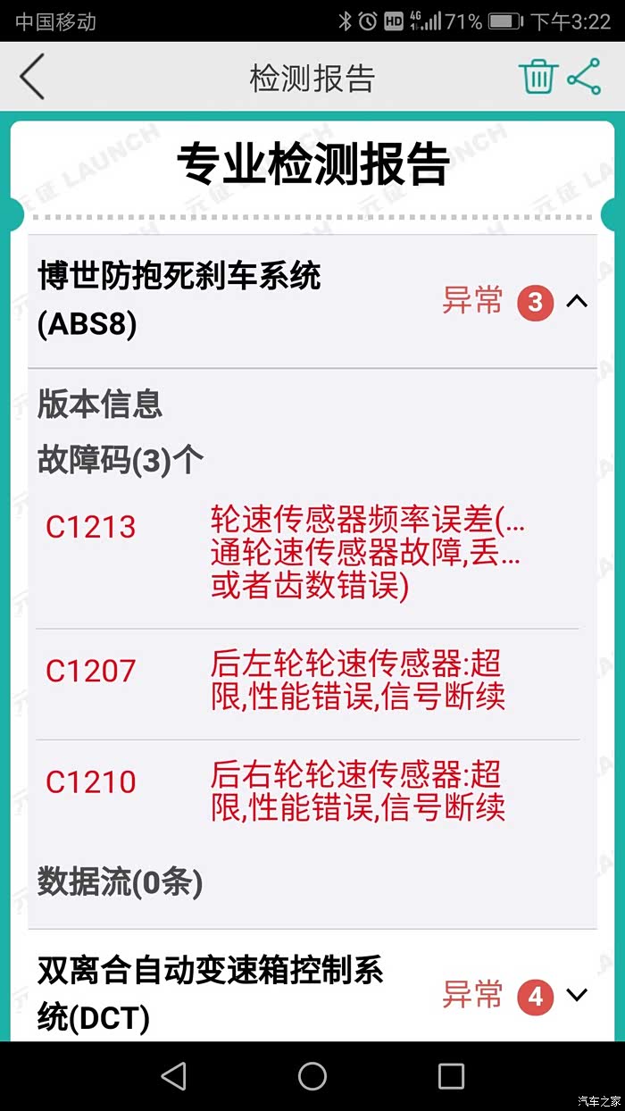 我的2013款l3自动舒适型刚年审完毕,一次性通过。车是2013年出厂,购买时已出厂近一年。年检前先上论坛,有坛友说可能obd不过。咨询了4s,说有的车不过,有的检测线不过,不过的写数据,写数据收费,并推荐市车管所检测线可过。于是到市检测线,一次性过。前面的车是一汽b50,在其它检测线不过,上线之前同检测员打招呼,后也是一次性过。看起来obd检测与检测线有关系。还有,下obd和排放检测通过后,我接到车,仪表盘大大的 “!”、abs故障,自己obd检测,一大堆故障码,自己用手机消除全部故障码后上安检线,一次性过。在环保检测之前,自己可是消除了故障码的。下图就是下obd检测和环保检测后的故障吗。