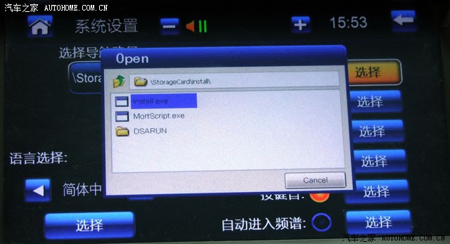 在弹出的文件选择框中,依次双击“StorageCard”、“install”文件夹、“install.exe”文件。设导航启动程序为install文件夹下的install.exe