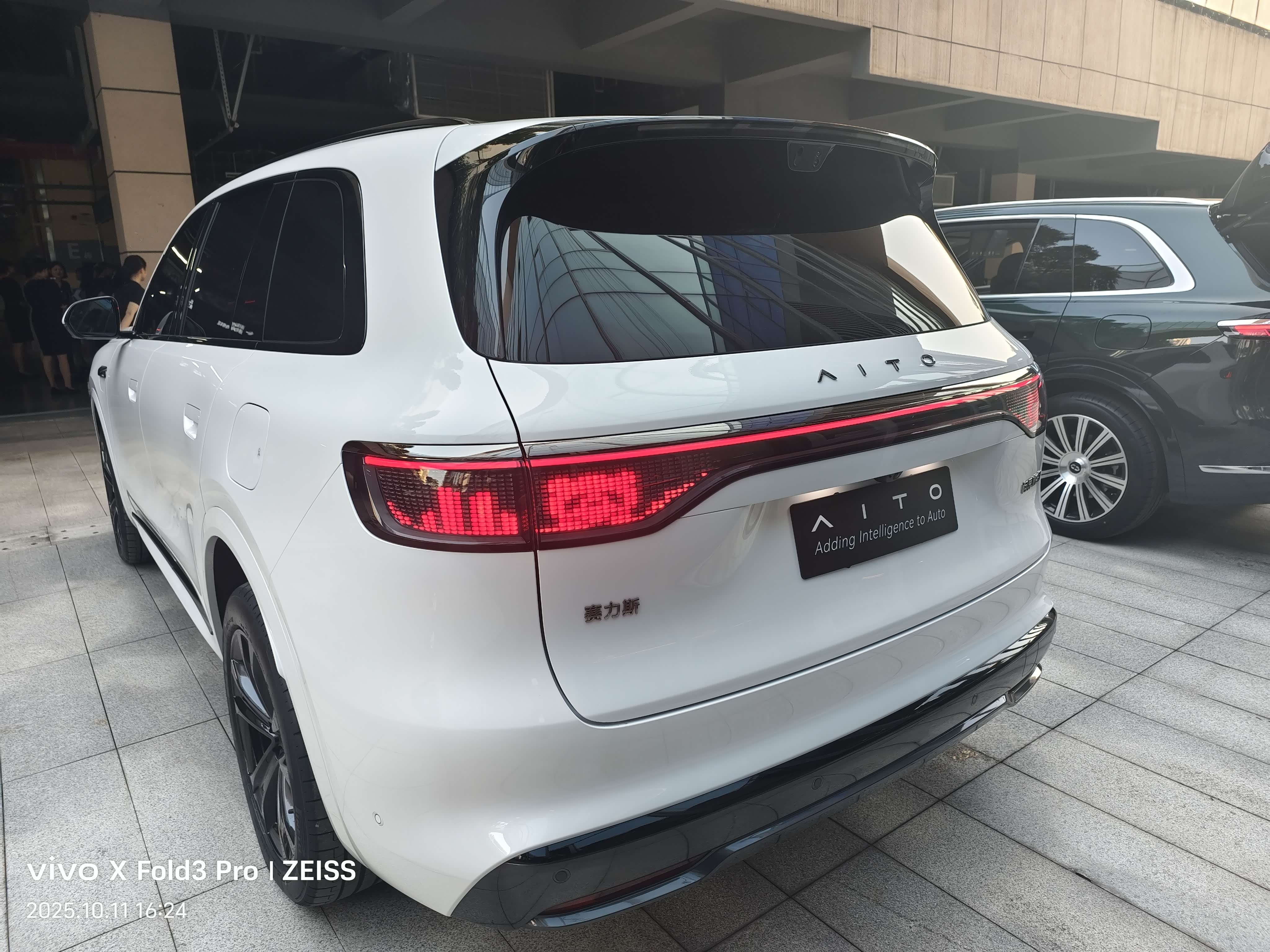 问界M8的外观设计极具辨识度,贯穿式天际尾灯如星河璀璨,点亮瞬间便成为车流中的视觉焦点;流畅的车身线条勾勒出大气舒展的姿态,白色车身搭配黑色细节装饰,在简约中彰显豪华质感。车尾“AITO”标识与“赛力斯”铭牌交相辉映,宣告着其在新能源赛道的高端定位。
