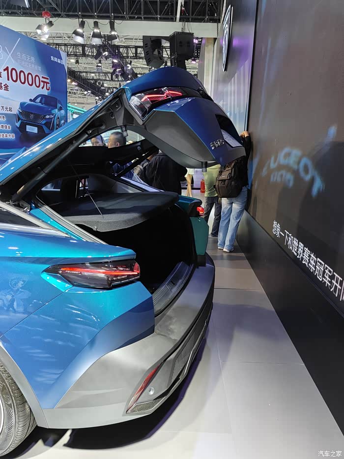 到达展厅以后,直奔2号展馆标致展台,对面的雪铁龙展台看凡尔赛的人挺多的,相比下来标致展台就冷清了很多,没什么人气,408X放在了标致展台最中间的位置,左右两边分别摆放了508L和新408,第一眼看过去,感觉三台车傻傻分不清楚,前脸基本上都一样的,走到408X面前,冰川蓝的颜色和漆面还是挺有质感的,法系车的漆水,不用多说。来到侧面,因为车长4米7的原因,跟凡尔赛对比起来,感觉还是短了一点,凡尔赛更有旅行车的味道,车身的线条也显得更和谐美观一些。轮胎同样都是205 55R19的固特异轮胎,但是轮毂造型的话我更倾向于凡尔赛的主动进气散热的花瓣轮毂更好看一些。车尾的斜爪尾灯确实很漂亮很有质感非常有个性,但是这个黑色的大包围显得很突兀,不协调,看上去总是感觉怪怪的。打开后备箱,后备箱开口是没有凡尔赛大的,后备箱空间也比凡尔赛略小一些,使用起来没有凡尔赛方便。408X的外观给我的感觉并不惊艳,凡尔赛是属于耐看型,外观对比我更喜欢凡尔赛。