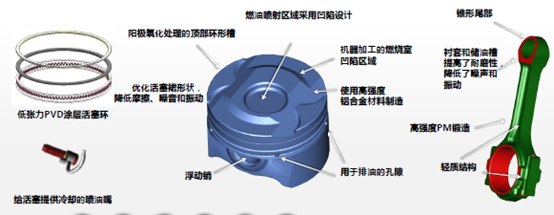 全铝合金发动机缸体、下缸体嵌入铸铁衬、锻钢曲轴、涡轮增压系统机油泵和平衡轴