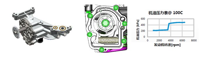 可变排量机油泵根据发动机工况自动调节机油流量,减小了在低速时过剩的机油压力,减少了对发动机的负载需要,配合DVVT进排气连续可变气门正时系统使发动机低转速更敏捷、高转速时更强劲。