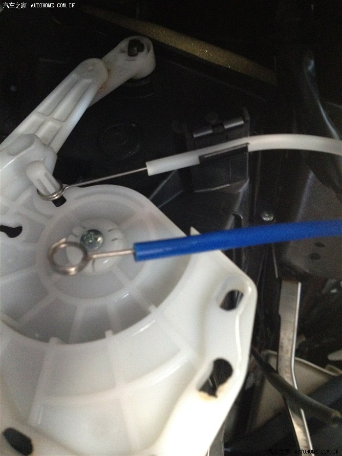第三步,为了接线,需将白色的空调控制器拆下。为此,我们需要先拆掉与旋钮相连的3根拉线。下图是驾驶员右腿旁的2根拉线,负责控制冷风和暖风的比例,另外一根拉线在手套箱上方,负责控制内外循环。那个地方拍照太困难,恕我没有拍