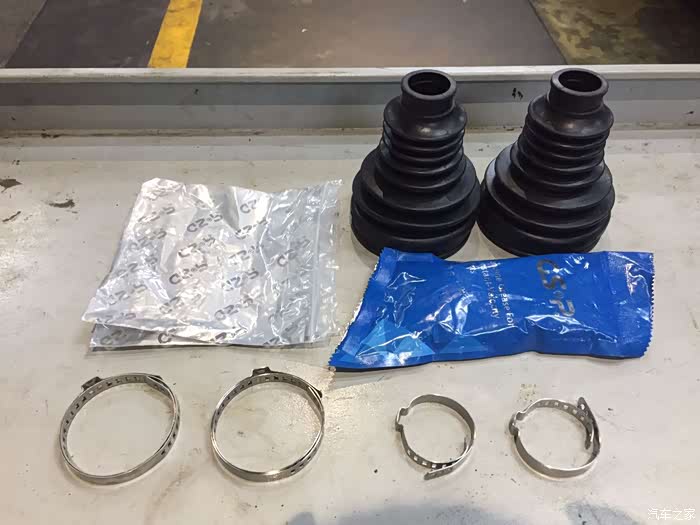买了整个的球笼套修理包进行修复,左右两侧各一个球笼套,卡子是必须更换的,因为球笼套的卡子是一次性的吗,用过了就不能再用了。