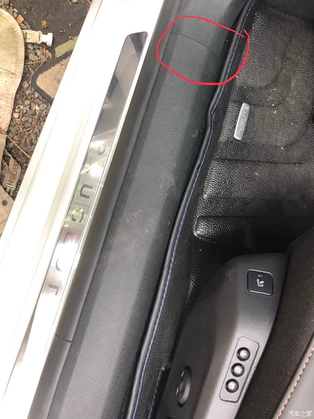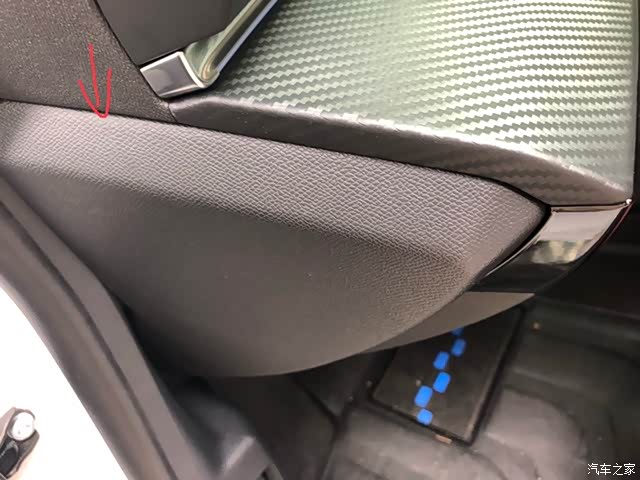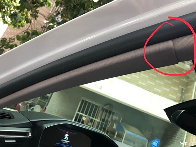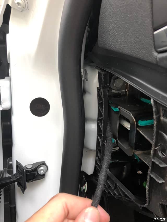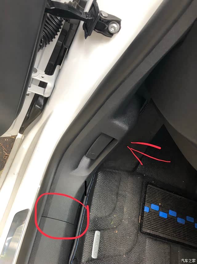 拆A柱这里的时候从标记位置开始往外拉,放心拉坏不了,拉开口上面有个扣子拿掉,就可以把护板整个拿下来了。