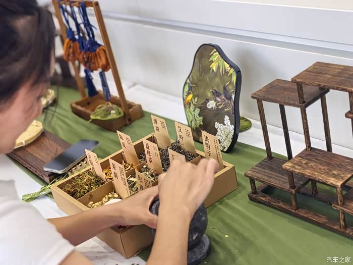 活动现场设置了中式香囊手工游戏区,淡淡的艾草、丁香香气便萦绕鼻尖,长桌上整齐摆放着绸缎布料、彩线、香料,还有精致的绣绷和小剪刀。古风屏风上挂着各式样的香囊图稿,流苏随着微风轻轻摇晃,氛围感直接拉满。手工艺老师现场指导,从裁剪布料、填充香料到缝制收口,每一步都耐心讲解。大家围坐在一起,穿针引线,一边交流制作心得,一边感受传统文化的魅力。亲手制作的香囊不仅能驱蚊安神,还能挂在博越L 车内,让古典雅韵与现代科技来一场奇妙碰撞!