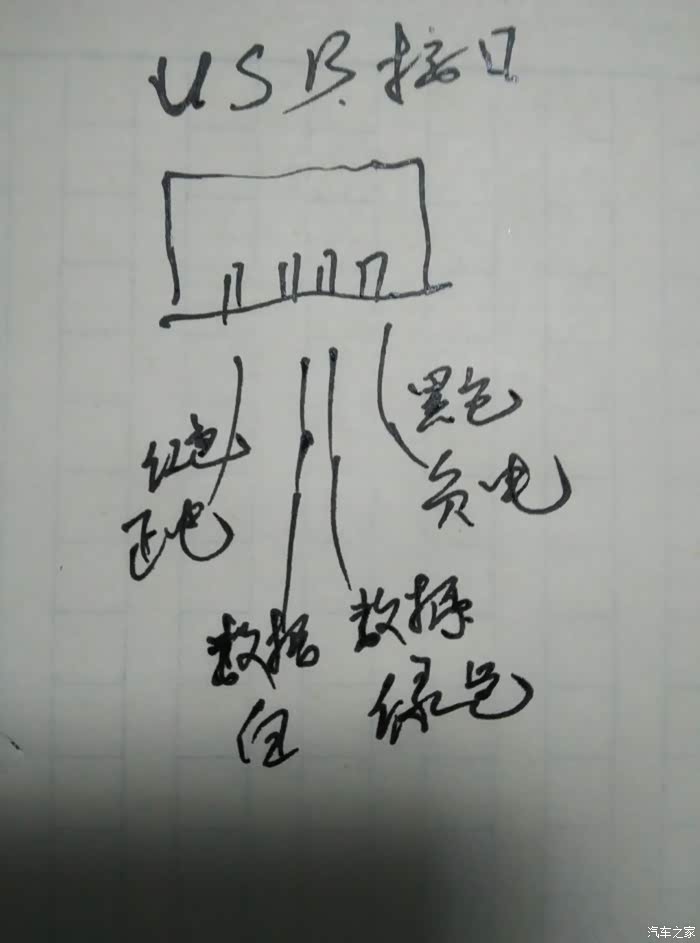 这是放到手套箱里的usb转接线,用miniUSB线改造,切记,线的接口,正极红接红,负极黑接黑,数据线白色和绿线交叉接,也许是我买的线的个例,自己琢磨一下,电源别接错就好。别在电源开的情况下接线,防止烧了保险,切记。