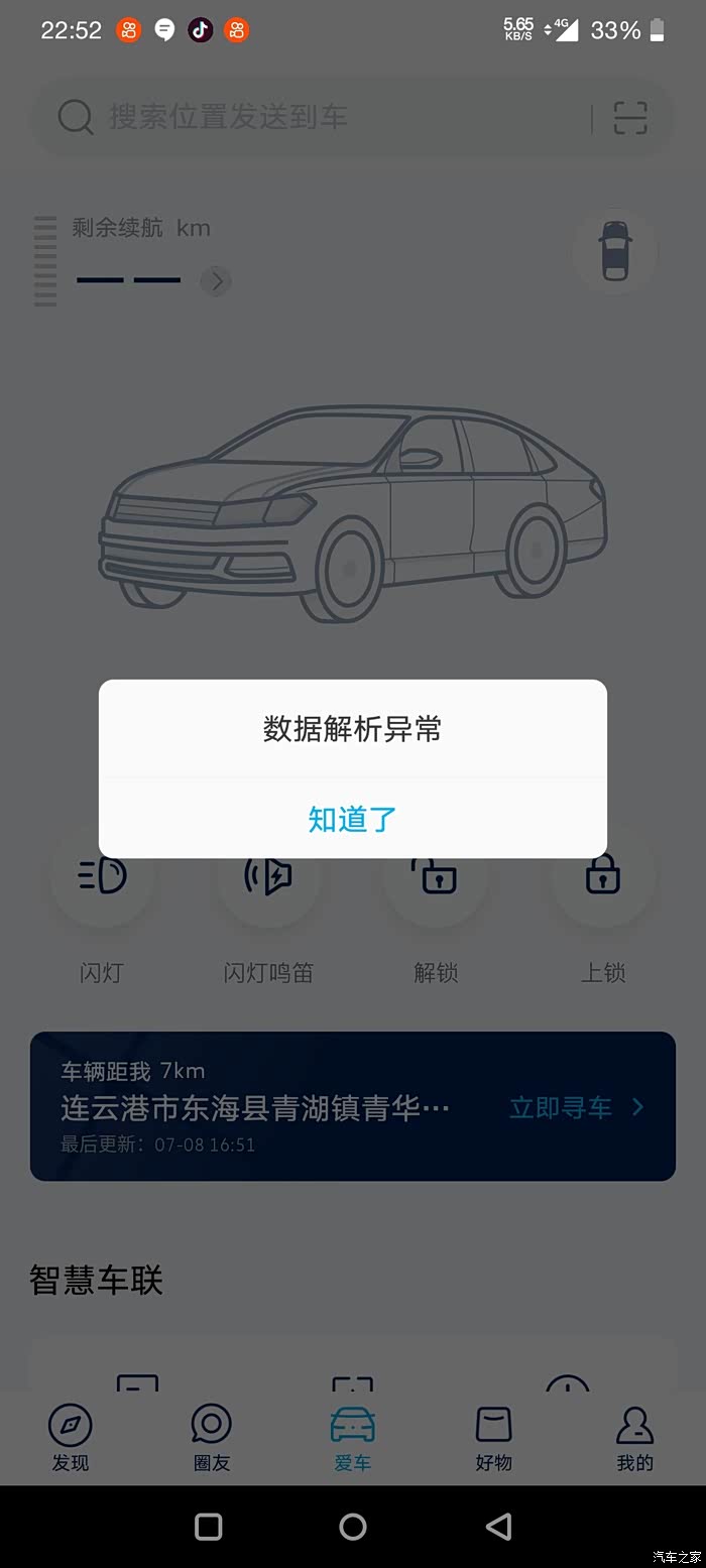 七月八号下午最后一次连接,后面再也连接不上了。无法更新车辆位置和信息,中控屏上面网络连接标志小地球变成灰色,连接手机热点也无法使用。多次尝试关闭打开,重启车机,恢复出厂设置。等待半个小时重置打开。打了客服电话,去了四儿子店。都没有解决。有没有兄弟遇到同样问题?
