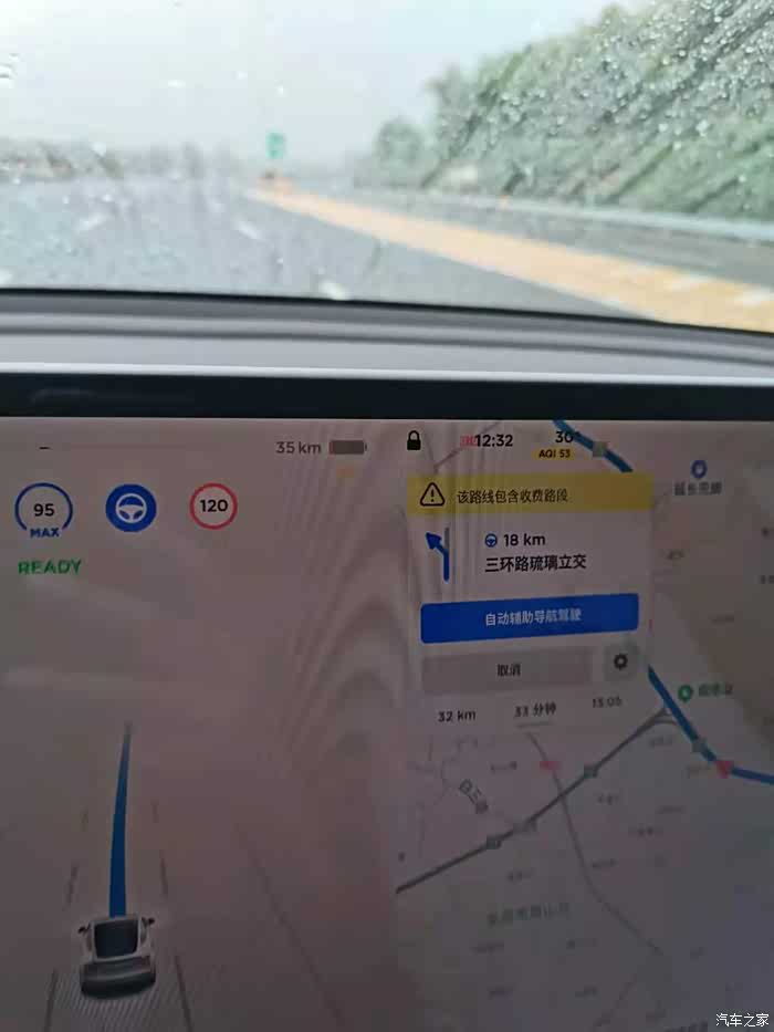 不得不说,赠送的EAP领航模式还是很方便,打转向灯自动变道,手要一直扶着方向盘,不然时隔一会儿就会提醒否者退出自动导航驾驶。途中遇到了暴雨,都没退出自动,能见度人眼看着都困难,但是车子居然始终保持在车道中间,这个确实牛。