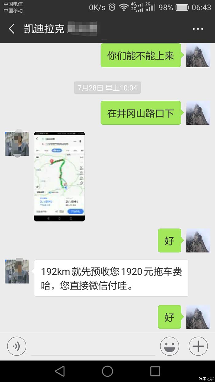 拖车4s店找的,拖车费要我自己支付10元/公里,他算得开心就好,我很从容给了他。