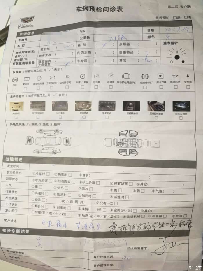 没有检查结果,其实维修人员诊断出是缸体断裂,说要拆解发动机。但是客户经理不给透露一点什么,说要明天才能拆发动机,一个检查搞了整整三天。特别是这个客户经理有些话听了很不爽:一直说自己不是“上汽通用”的,与自己无关系,有什么事找厂家。
