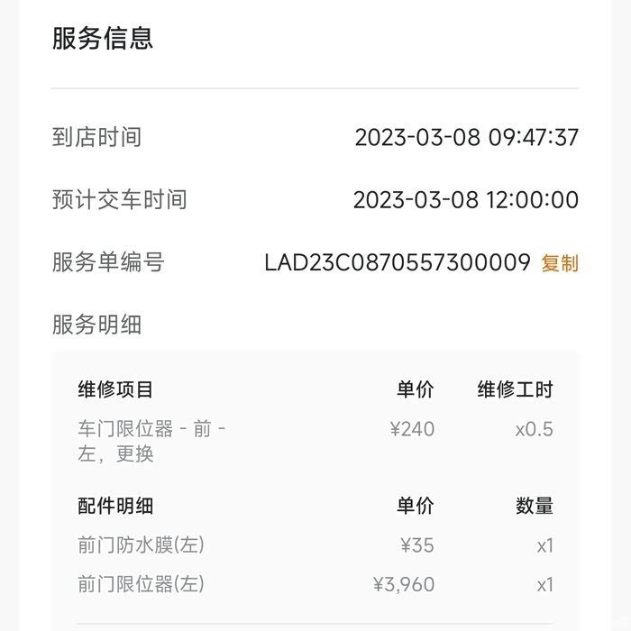 因为电动门关闭时有较大异响声,观察了一段时间确定是经常性发生的问题,联系了极氪家的售后伙伴,约好进店检查时间。通过各项检查确定异响问题出在车门限位器上,需要进行更换,当然在质保范围内,不需要车主花钱,如果配有自动门的车友有相同的异响,建议进店检查维修。同样还是滴滴专车先回家等待,然后维修完毕洗好车安排代驾将车送回。