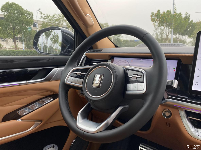 中控台上配备了12.3英寸液晶仪表盘和14.6英寸悬浮式中控屏幕,支持多项智能功能,像是高德地图导航,语音识别控制等等。说到这,就要说说它的语音识别系统了,真的还蛮好用的,只需要一句“坦克坦克,请帮我打开空调,导航去(目的地)”,它便可以按照你的指令按部就班去做了,智能便捷。