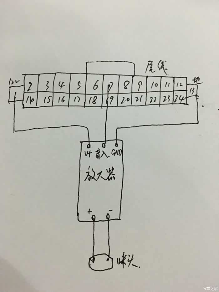 低配车型更换高配cd后可以连接蓝牙打电话,但是cd上不带麦克风,对方无法听到声音,可以参照此图接线。7号针脚为声音输入,可以接一个咪头到7号和19号针脚,但是声音效果不好,得对着咪头大声吼对方才能听到,故可以在中间加一个放大器,加上之后效果很好,正常说话对方就可以听清楚。有需要的可以参照此图。放大器马云家搜索驻极体放大器。价格30以内。