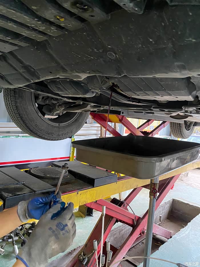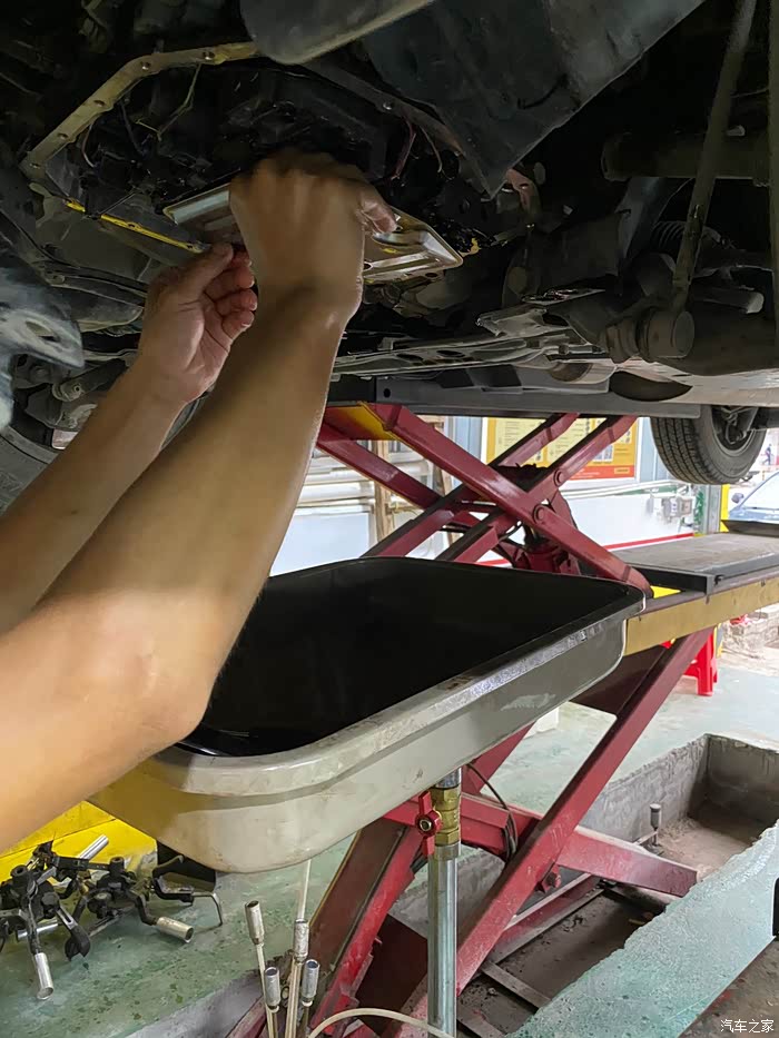 因为跑了长途回来3个多小时路程160km,直接去修理厂拆油底壳放油1L+2L油底壳油,更换变速箱滤网,清洗底壳和铁屑。