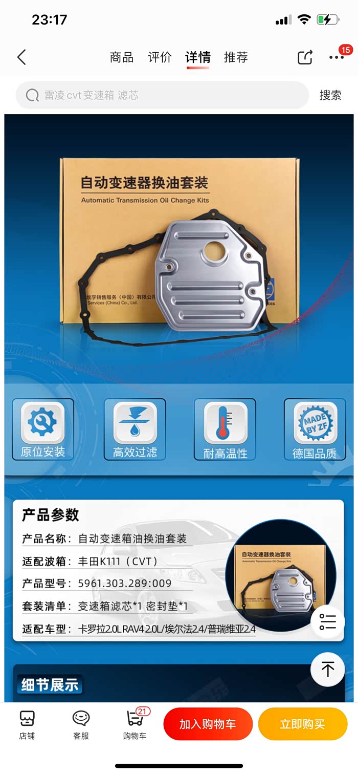 备注一下:用的是采埃孚变速箱滤网,垫片塑料的没换,依旧用原厂的铁片垫片。