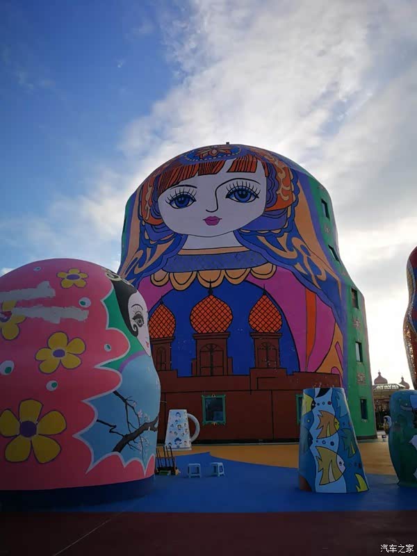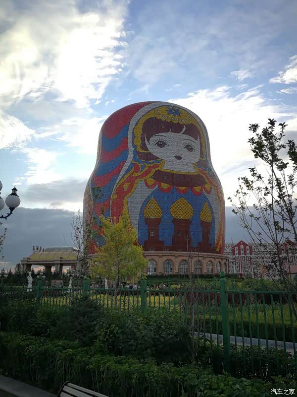 小城镇不大,我们在旁边一家面馆吃的羊汤面,味道不错还有大包子,老板很热情,告诉我们走哪个路去呼伦湖好走。去呼伦湖路上的风景很好看,有一条叫呼伦湖路,路上有高山,有大风车,云邸下阴晴不定的草原,还有拦路的牛大哥,怪不得都说草原之美在路上!到了呼伦湖,门票四十,开高尔夫嘉旅进去需要加五元,进去之后发现湖很大,不过每个人的家乡都有水库吧,感觉差不多,这个景点上厕所竟然要一块钱,往前走两步就有免费的。太阳有些晒,在湖边扔了几块石头打水漂儿玩了一会,孩子还是比较喜欢玩水的,叫了好几次都不想走!吃了点水果和零食,出发去满洲里,有两条路去满洲里,本来想走原来的路,因为风景很好看,但是又好奇一级公路的景色,选择了大路很宽阔,但车也多,而且都是穿梭乡镇城市之间,很遗憾没有走呼伦湖路,看到路灯弓箭的造型,老公来了一句:只识弯弓射大刀!很搞笑!到了满洲里,未了满足孩子的心理住在了套娃广场,幸好提前一天预定,到前台办理手续听说已经没有房间了。酒店本身就是一个大套娃造型,开车的路上远远就能看见,而且酒店赠送套娃广场的门票,按床位赠送,还包含早餐,这样也比较划算了。到了酒店简单休息了一下,然后经保洁阿姨推荐去满洲里市里吃晚餐,比酒店好还合适。于是找了一家评分较高的卢布里俄式西餐,果然里面服务员有一半是外国人,而且很好看,我们点了几个网友推荐的特色美食,果然没有失望,真的很好吃,吃的超饱,消费不到三百块钱,下次去还要在这吃呢!门口迎宾的老外是个大帅哥哟!