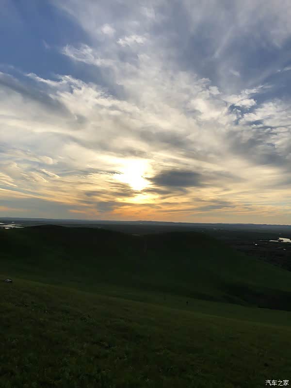 接下来是我认为草原之行最美印象最深的一处风景了,跟着车流上了山,七点多开始日落,我们六点多上山就已经很多人了,到了山上站在高处美景尽收眼底,日落,高山,草地,湿地,像画一样美,此生难忘。友情提示,车辆玩爬坡一定要四驱,穿长衣长裤,喷花露水!日落结束下山的车辆川流不息,场面很壮观