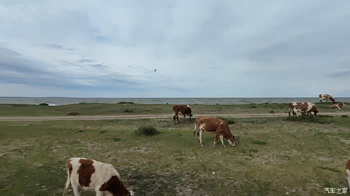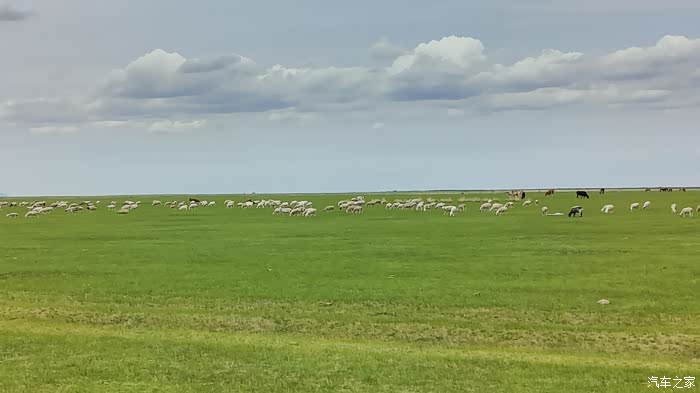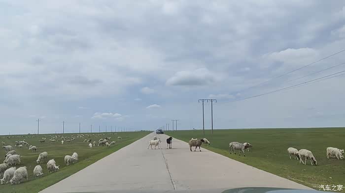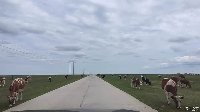 去往贝尔湖的公路上没有什么车。笔直的公路延伸在一望无际平整广阔的草原上,公路两旁也没有了栅栏,成群的牛羊在公路上穿梭自如,悠闲得很,这里是他们的真正的家园。