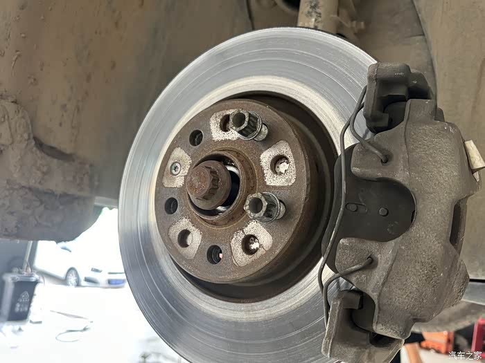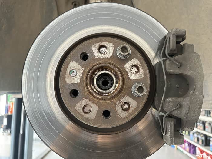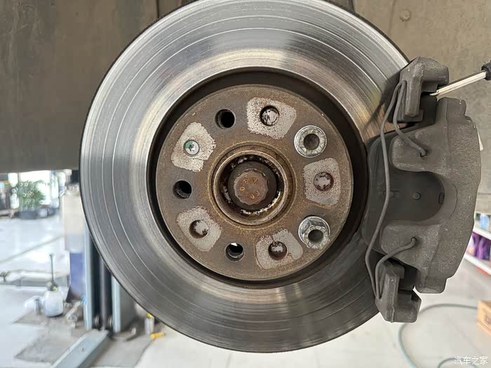 刹车盘中心的螺栓就是半轴固定螺栓了,将这个螺栓拧下来就可以将半轴外球笼和轴承分开,这一步还是比较简单的,毕竟大力出奇迹。