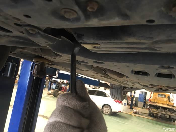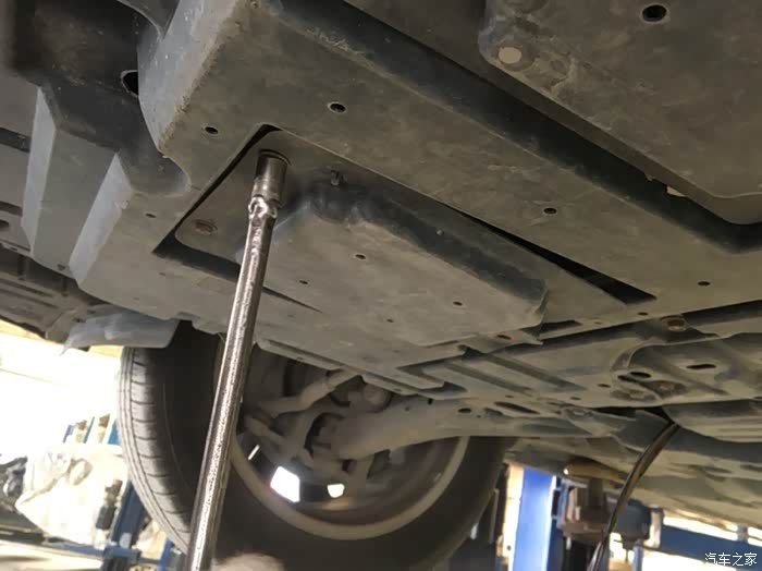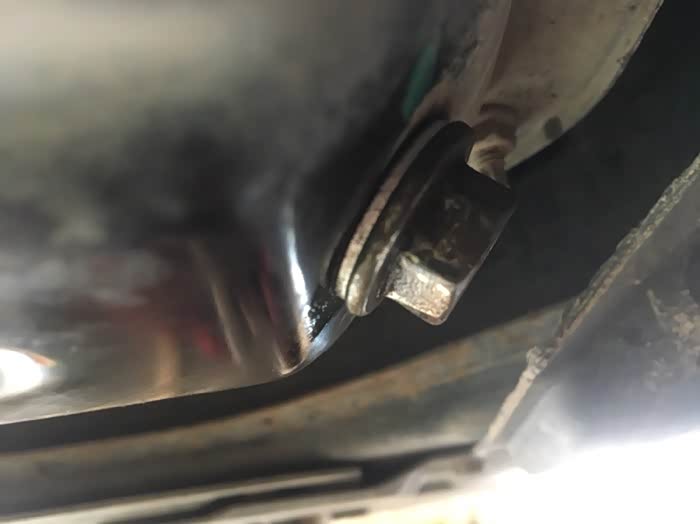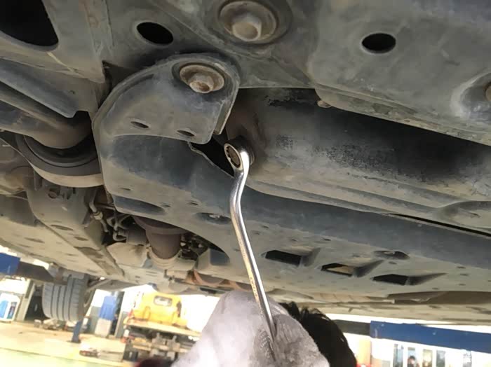 准备排放旧机油。先拧开油底壳的放油螺丝。