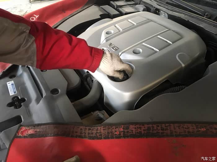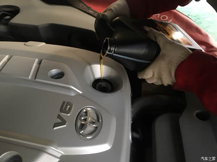 正在加注新的机油。这款皇冠所用的机油大概需要六升。所以需要一大桶两小桶。