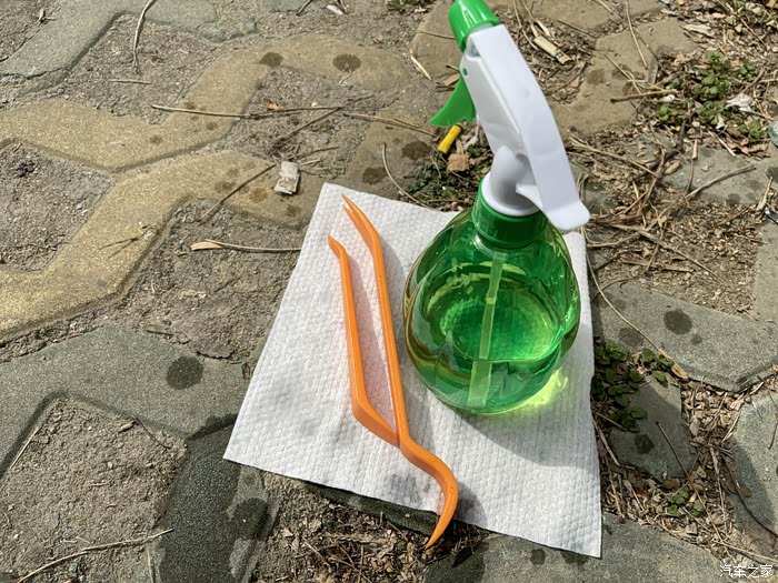 第一步先喷点水,将缝隙里的灰尘和赃物冲冲干净,防止橇的时候划伤漆面。