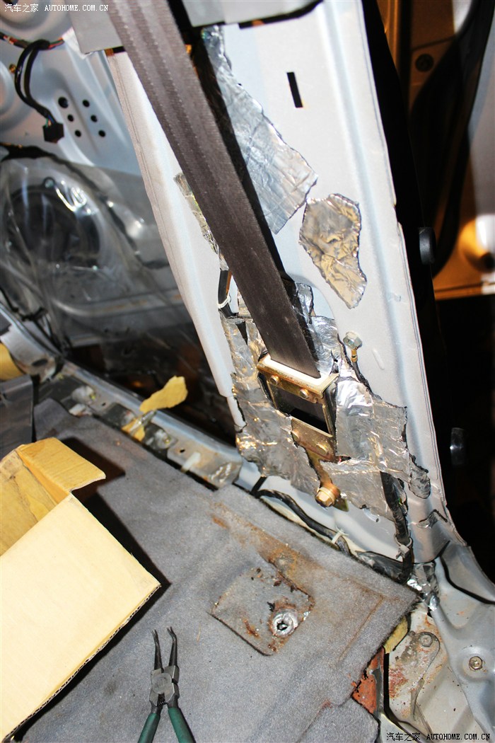 现在揭晓为什么要拆中门柱,这里面也是个空腔,大量的洞洞传播风噪,堵洞,止震,隔音。