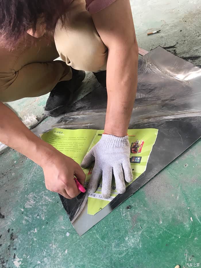 师傅用一页书按照灯和前杠的位置画了大概的轮廓 然后从另一辆报废车上把引擎盖的铁皮拿来剪成型