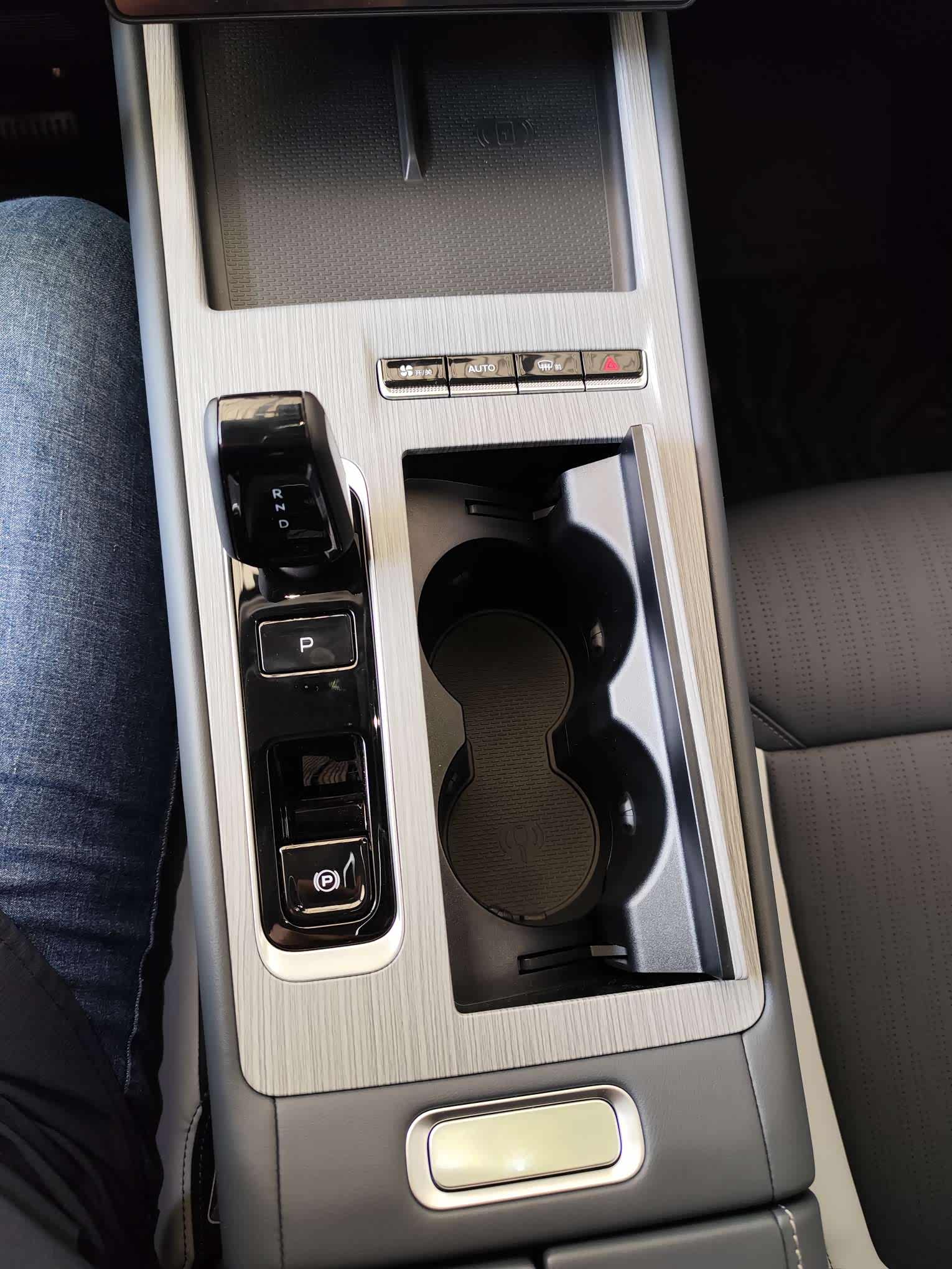 新设计的中控地台比23款的钢琴烤漆面板感觉好很多,不容易刮花还不会留指纹,喜欢这个内饰。增加的一些实体按键算是锦上添花吧,你好吉利还是很好用的。这个挡杆的设计也与领克09一样,换成水晶挡杆的话那质感很好,不然这个黑色的挡杆视觉效果没有23款的好,手放在挡杆上没啥承托感,太秀气了,与外观气质不太符合。不过这个小挡杆倒是让P档和电子手刹的按键做大了,更方便操作些。杯架设计也挺好的,不用的时候关上整体感好,不容易进灰。打开的时候放水杯固定也好,不放水杯放钱包也比较好拿取,比单一的杯架应用场景多一些。