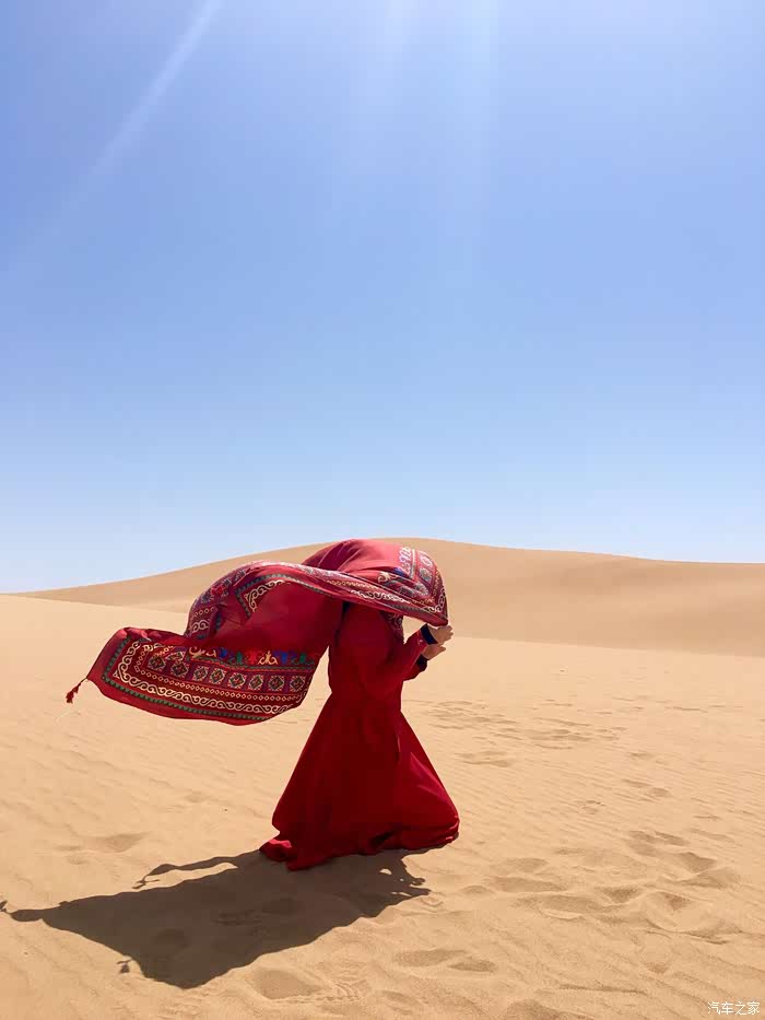 爱美的媳妇,今天也很应景的穿了一身红色连衣裙。因为沙漠的风很大,想给媳妇美美的拍几张,也以失败告终。