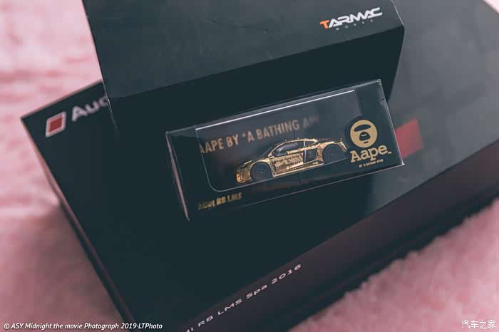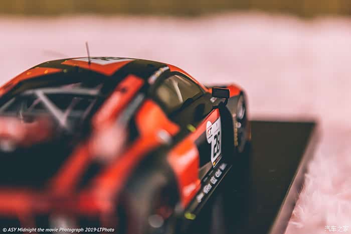 最左面的也是R8 LMS,比例小一些,而且是AAPE涂装,香港I.T赞助。中间的是GT级别的458赛车,来自BBR,那个也是联名款——BAPE,不过这一次的主角是最右面的那个,1:18超细节!