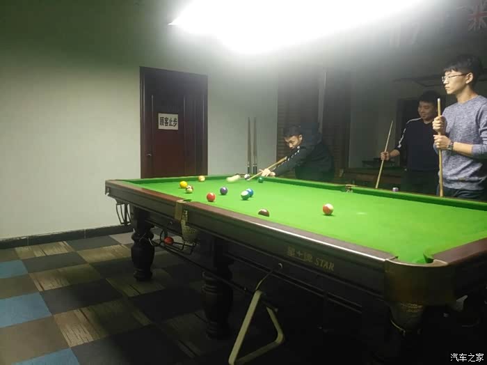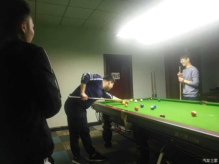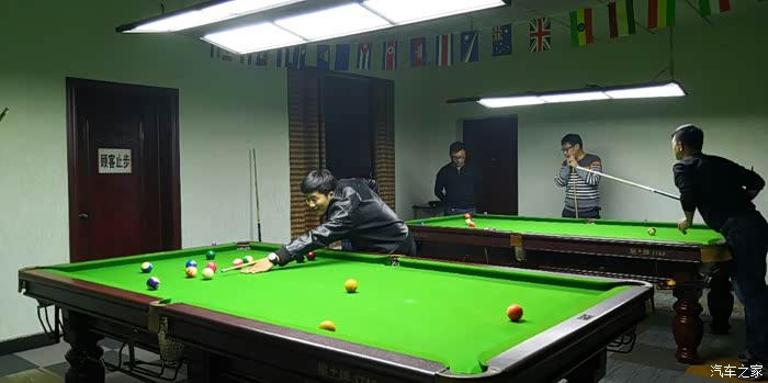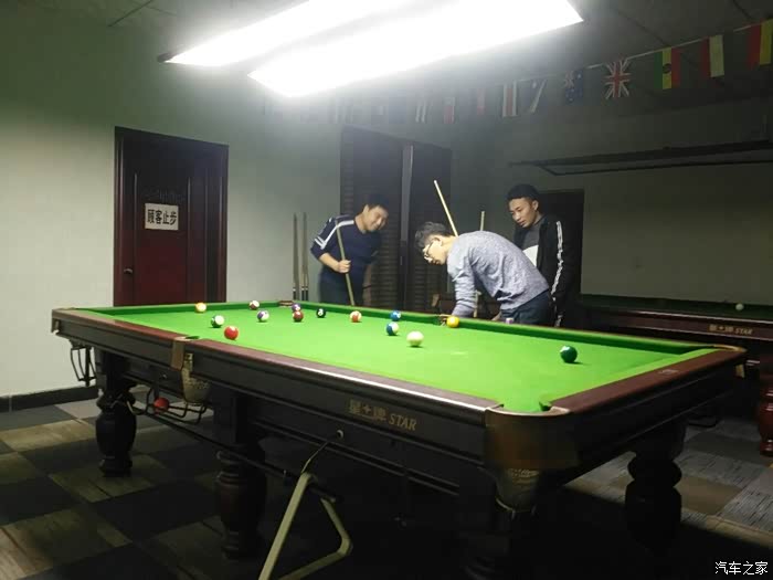 中午饭是下午一点多开始的,很丰盛的,都开着车,所以不喝酒了,山楂树下,可乐,毛血旺,粉丝娃娃菜,硬菜烤鸭,没毛病,还有日本豆腐,大拌菜,饺子,青椒炒肉吧,太多了,记不过来了,满足了自己的胃,吃的太爽了,最好一个月组织一次这种的聚会,吃饭期间就商量好一会有啥娱乐活动了,附近有啥好玩的,不如一起打台球吧,可以,去了一家台球厅居然没位置,就在我们刚要下来的时候,看到一台GS在倒车,会长上去打招呼,不认识?一问原来是车友的老公,一番交谈后,他认识台球厅的人,给我们开了一个VIP房间,瞬间满满的集体荣誉感,看到没,哪里都能遇到车友,赞赞赞,因为只有一张案子,所以大家轮流上阵,输得下阵,车轮战,打得很是痛快啊。