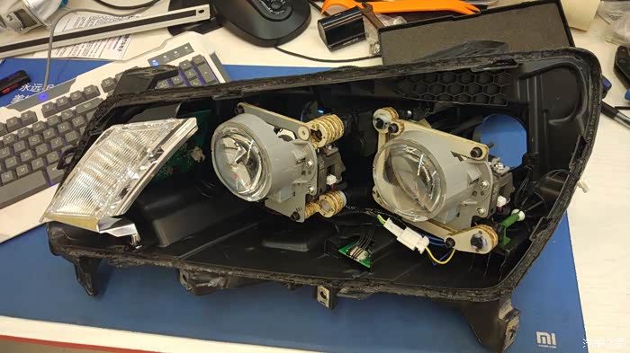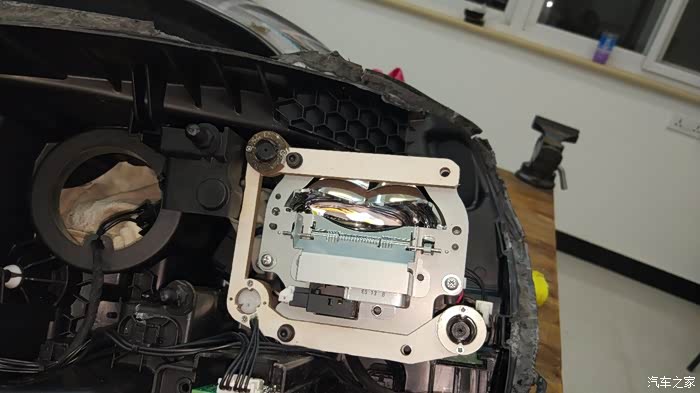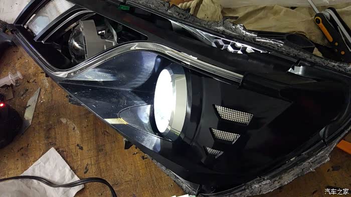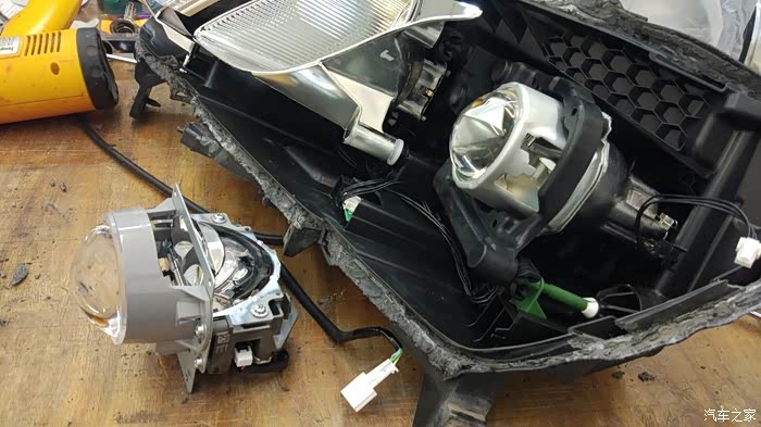 想问原车远光位的灯碗呢?取下连接脚之后就扔一边了,然后是测试切割,既要能装回去,还不能影响透镜位置。不装回去原车远光位下面镂空的地方不好看,结果就是打磨成这个样子。壁纸刀是别指望了,切不动,需要动用小型的手持切割器。【左面原车样式,右面打磨合适的样式】