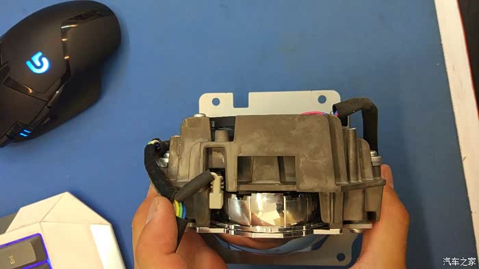 大灯裸奔的样子。左下角那个就是一体式LED双光透镜,灯芯是镶嵌在灯座下面的,发光面向上,灯芯并不是在灯碗的最后端。这种一体式透镜的好处在于灯碗和灯芯是设计测试过的,整体的光照效果可以说是完美匹配。前面的透镜片是树脂的,非玻璃制品。后面为了制作支架,这个透镜反复的拆装,透镜落了很多灰尘,注意擦的时候用眼镜布,不然留下划痕除非用羊毛+抛光蜡,不然划痕就下不去了,这都是经验教训...