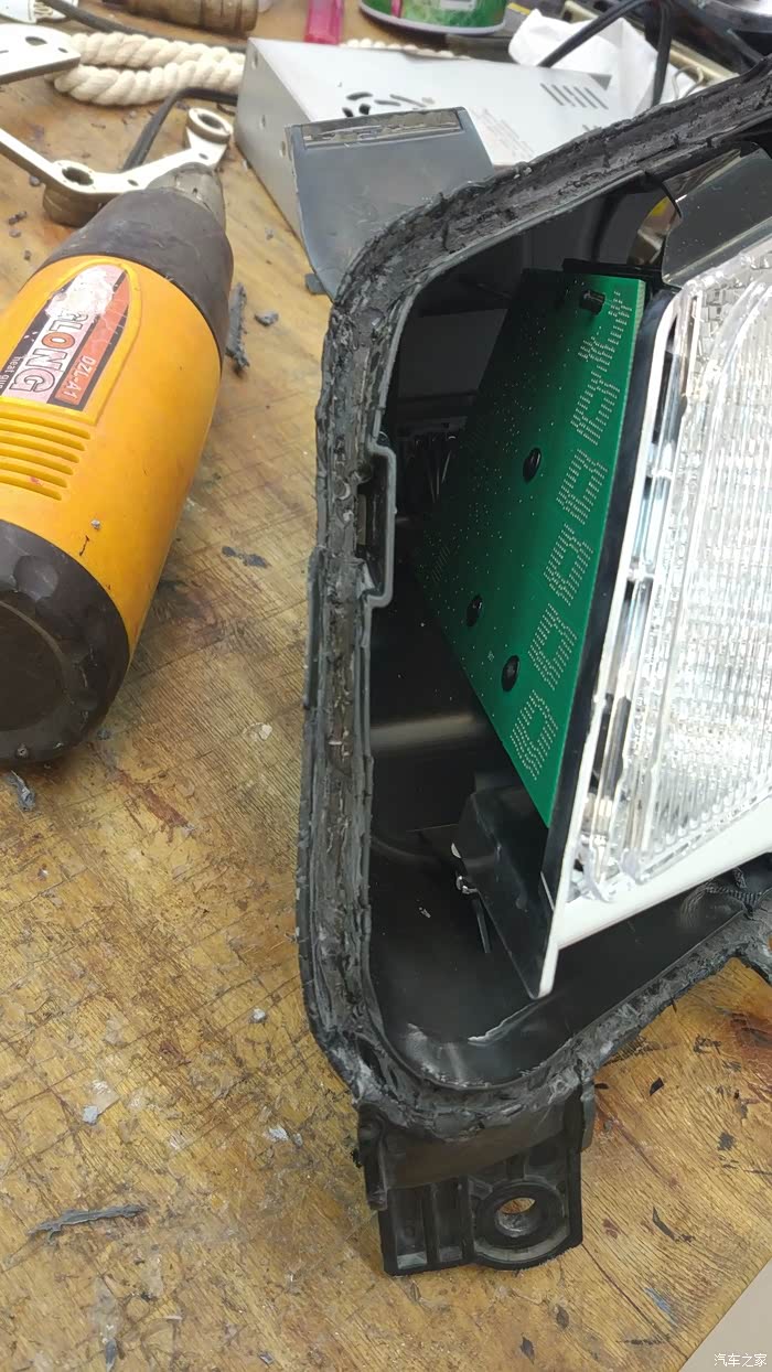 第二步拆灯罩,帝豪用的竟然是冷胶密封!!!虽然冷胶密封效果好,可是对于拆等的人来说简直就是噩耗,一个灯拆3个小时,俩灯6个小时!换热胶6个小时都能拆完再装回去了。冷胶加热没效果,只能把外圈的塑料烤软摆开。