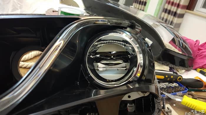 下一步开始修理灯框,近光位的银色装饰罩需要打磨扩大,LED大灯的透镜比原车的要大很多。