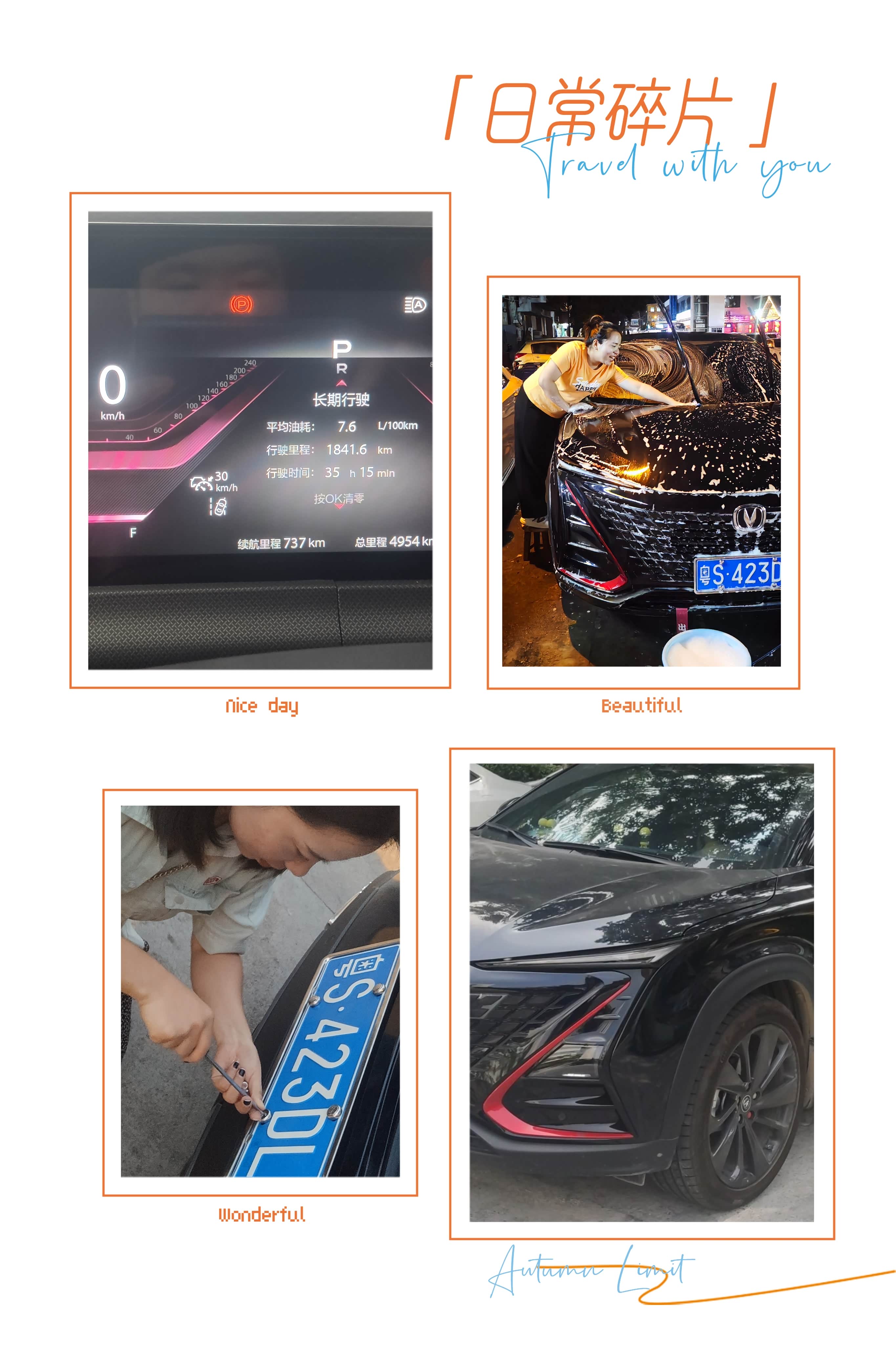 记录了第一次开车回家的1800公里路程和在路上用了30多个小时的时间,老婆给爱车装铁牌,动手洗爱车。