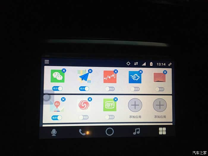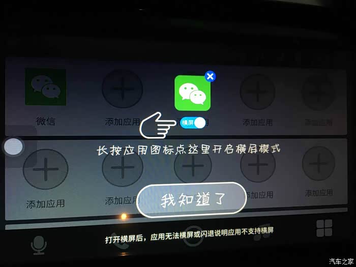 用手滑动汽车屏幕页面,进入APP设置页,系统提示要打开APP下方的横屏选项,使得APP内容可以与汽车屏幕适配。经过一段时间的测试,我发现并非所有APP都能通过“横屏”适配汽车屏幕,所以我只装了一些适配好的或常用的,毕竟汽车屏幕只是辅助用途。