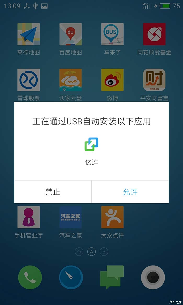 这时看手机,上面弹出“正在通过USB自动安装以下应用”,手动点击“允许”,手机上下载并自动安装“亿连”APP。这一步非常关键,如果你没点“允许”,可能就导致安装失败了。