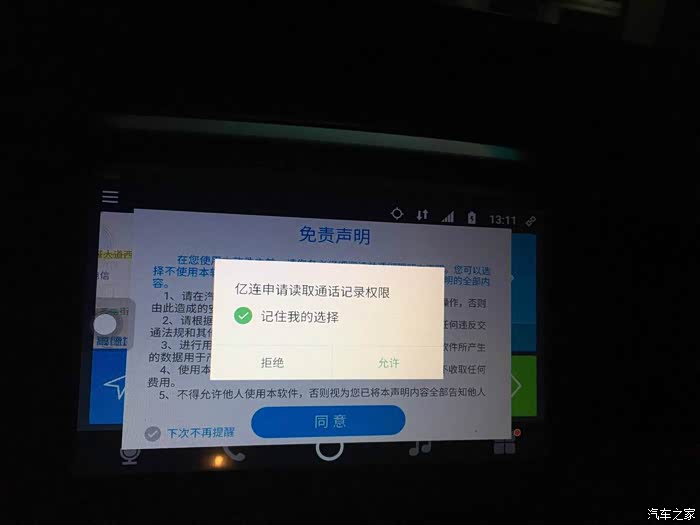 手机APP安装成功后,汽车屏幕上接连出现一些要求取得手机信息读取权限的请求,根据你自己对“车机互联”的功能需求,进行“允许”或“拒绝”授权。