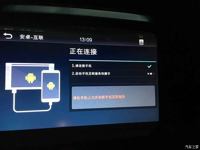 汽车屏幕显示正在连接手机,注意下方要求允许在手机上安装手机互联服务的提示