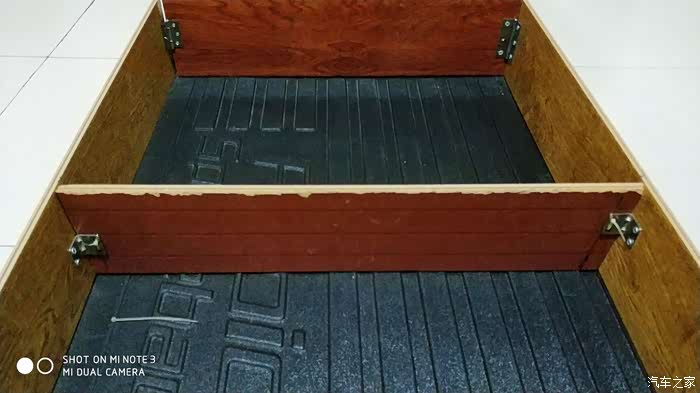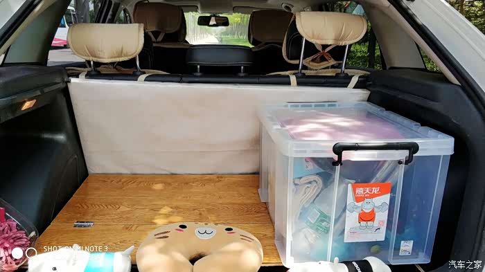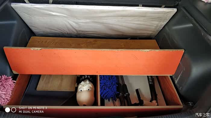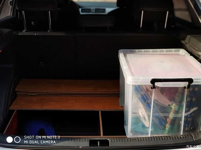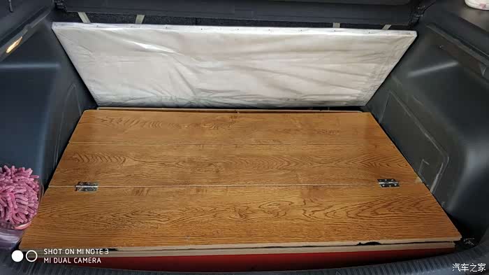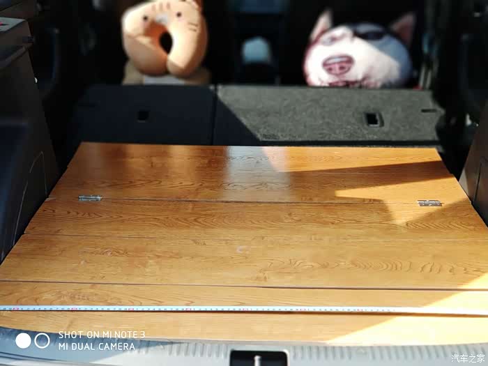但我可以将此木工板横放在后排座椅后(有斜度),非常轻松方便就可放入。而且不影响上面的后备箱隔板的卡扣。