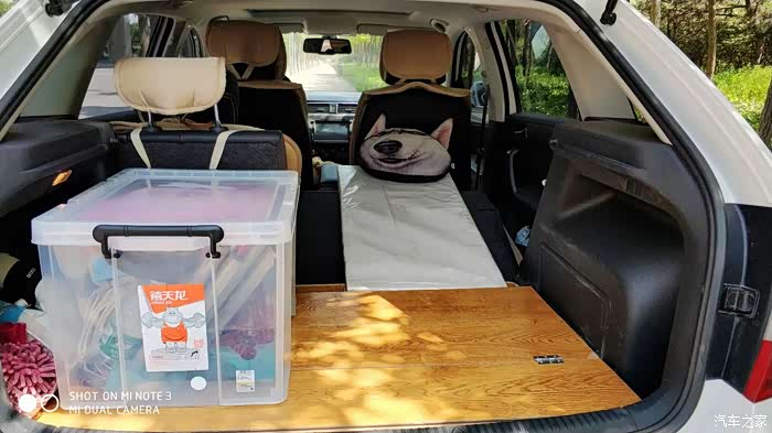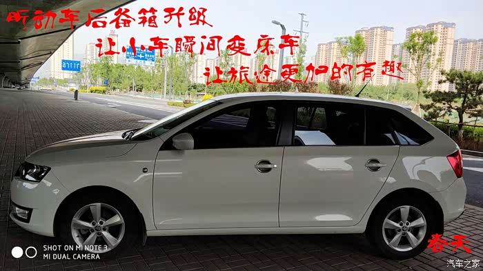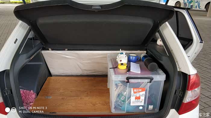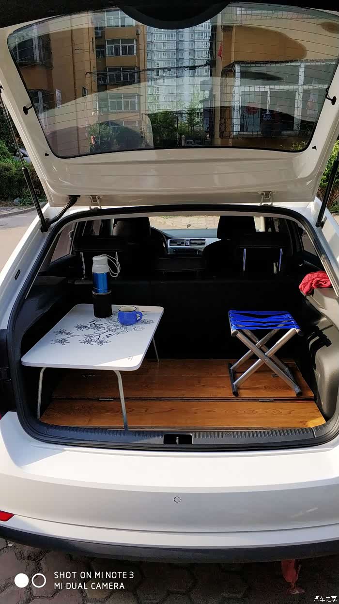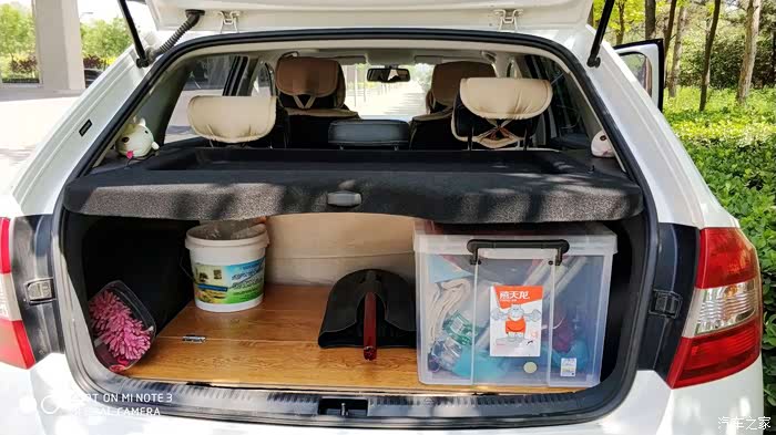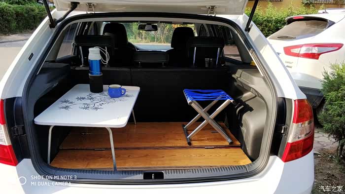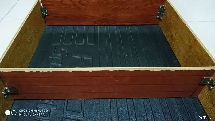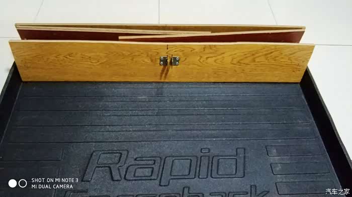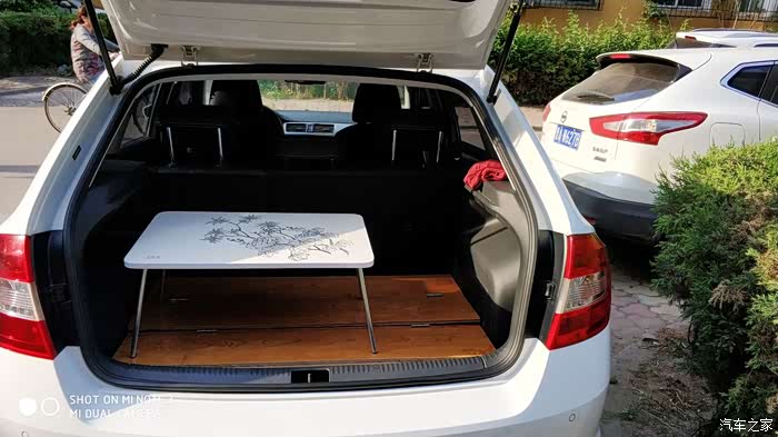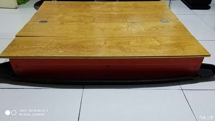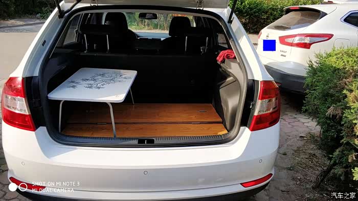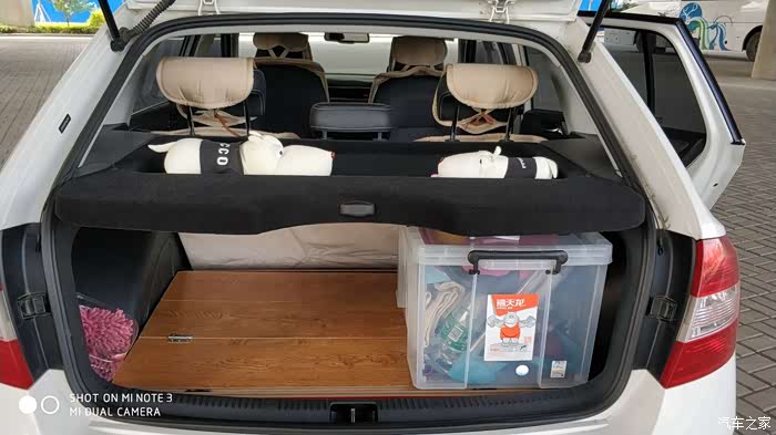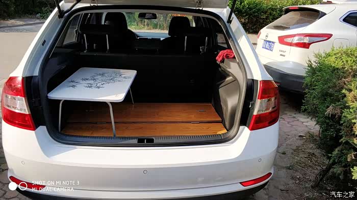 ,但每个人都有着各自不同的情况,房车一方面价格比较高,停车小区又不好停,平时上下班等等问题还是不太方便。所以大部分家庭还是将轿车或其它小型车作为首选。我两年前新购了一台斯柯达昕动小车,此车是一部两箱车,停车比较方便,还省油,本人认为此车最大的优点还是后备箱后盖可掀起,空间大,座椅可四六放到,五一节前几天,自己还想着怎么能改造一下后备箱,在以后出去游玩时能在车中休息或者住宿。正好小区五一节前清理整理小区卫生,楼下有很多废弃不用的各种木材和装修材料等,顺便看到了一些复合地板块被人废弃不要了,想了想何不选上几块好些的,改造一下后备箱,所以拿了6――7块上楼回家动手设计了一番,最终设计制作了一款简单实用的后备箱小床箱,后经实践,本人觉着还行特将此款小床箱介绍给各位车友