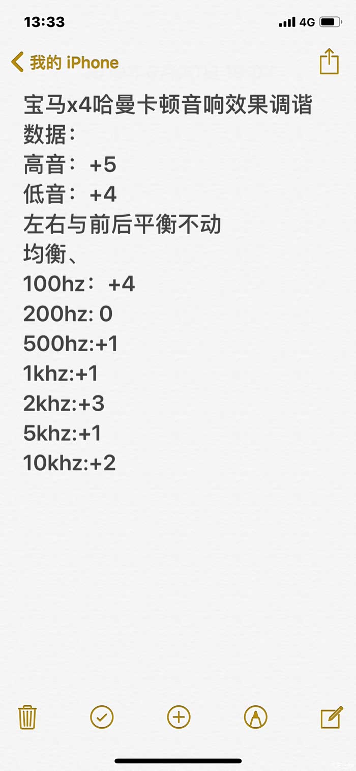 我把数据写这了、大家可以尝试一下、另外每套音响都有一个煲机的过程、别小看煲机的作用、这跟新车磨合期的道理差不多、新音响使用初期、尽量多听不同类型音乐、音量要经常变化、使其振膜震动不会那么生硬,让其变的柔顺、自然,这样发出来的声音就很美了。车载音响不能像我录音棚里的那样、单次60小时煲机、所以大家记着用一段时间来磨合音响!成效显而易见!我现在用车将尽一个月、音响效果比刚提车那会已经好很多啦!