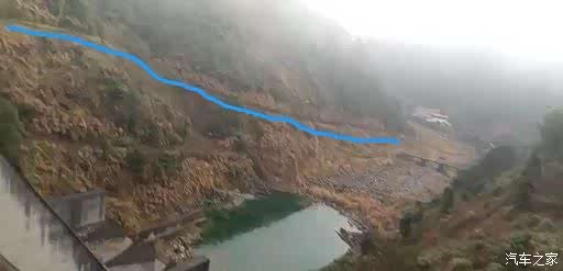 寨子里的水库百丈大坝下,就问落差大不大。蓝色是下游山旁盘山公路