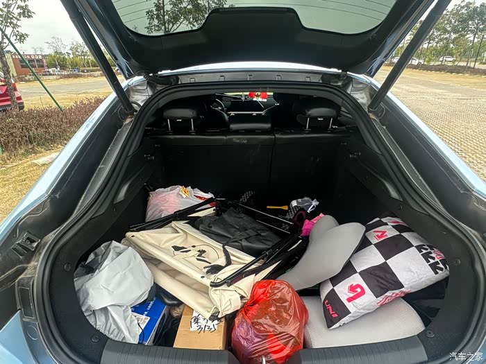 左边塞折叠雨伞和玻璃水,右边卡住青瓷茶具套装,中间纸巾盒用魔术贴固定,过减速带也不会“咣当”乱响。实测后备箱塞满状态下,后轮悬架会稍微硬点,但跑高速反倒更稳当。