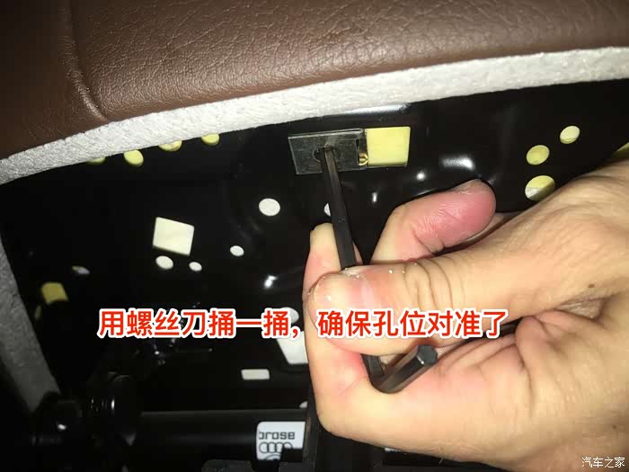 装好卡子以后,就可以将抽屉支架用两颗螺丝固定到座椅底部,这也是最麻烦的步骤,因为拧的时候看不见里面的情况,基本上要靠摸索,需要用到4mm的内六角扳手,稍微长一点的,比较好拧。