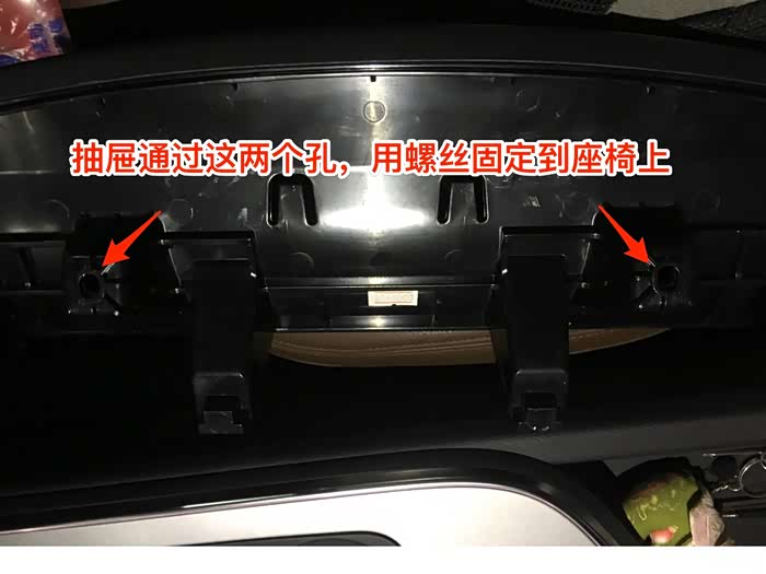 抽屉支架上有两个孔,螺丝将会通过通过这两孔固定到座椅上